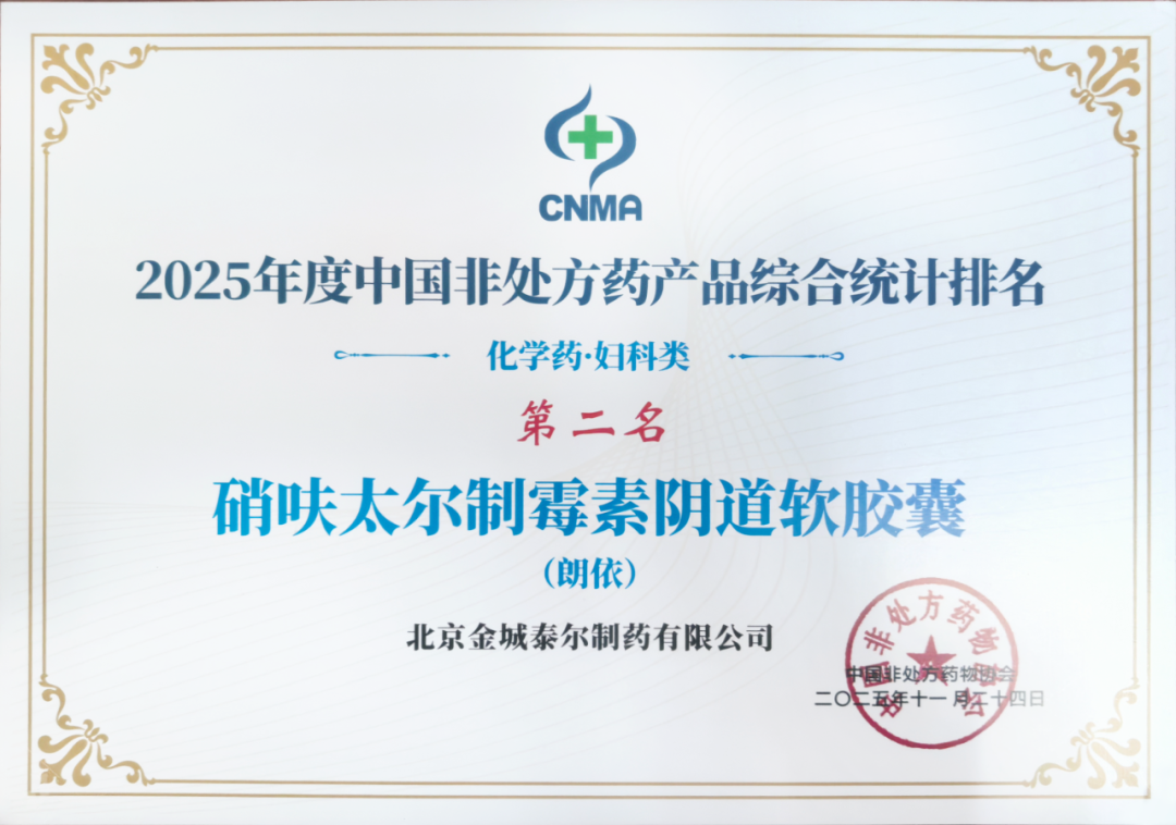 金城泰爾朗依?硝呋太爾制霉素陰道軟膠囊獲2025年度中國非處方藥產品綜合統計排名化學藥·婦科類……發表時間:2025-12-31